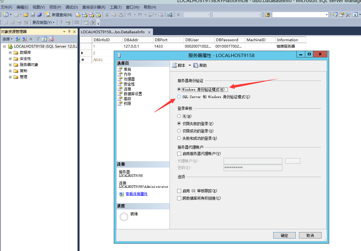 将“服务器身份验证”改为“SQL Server和Windows”模式。